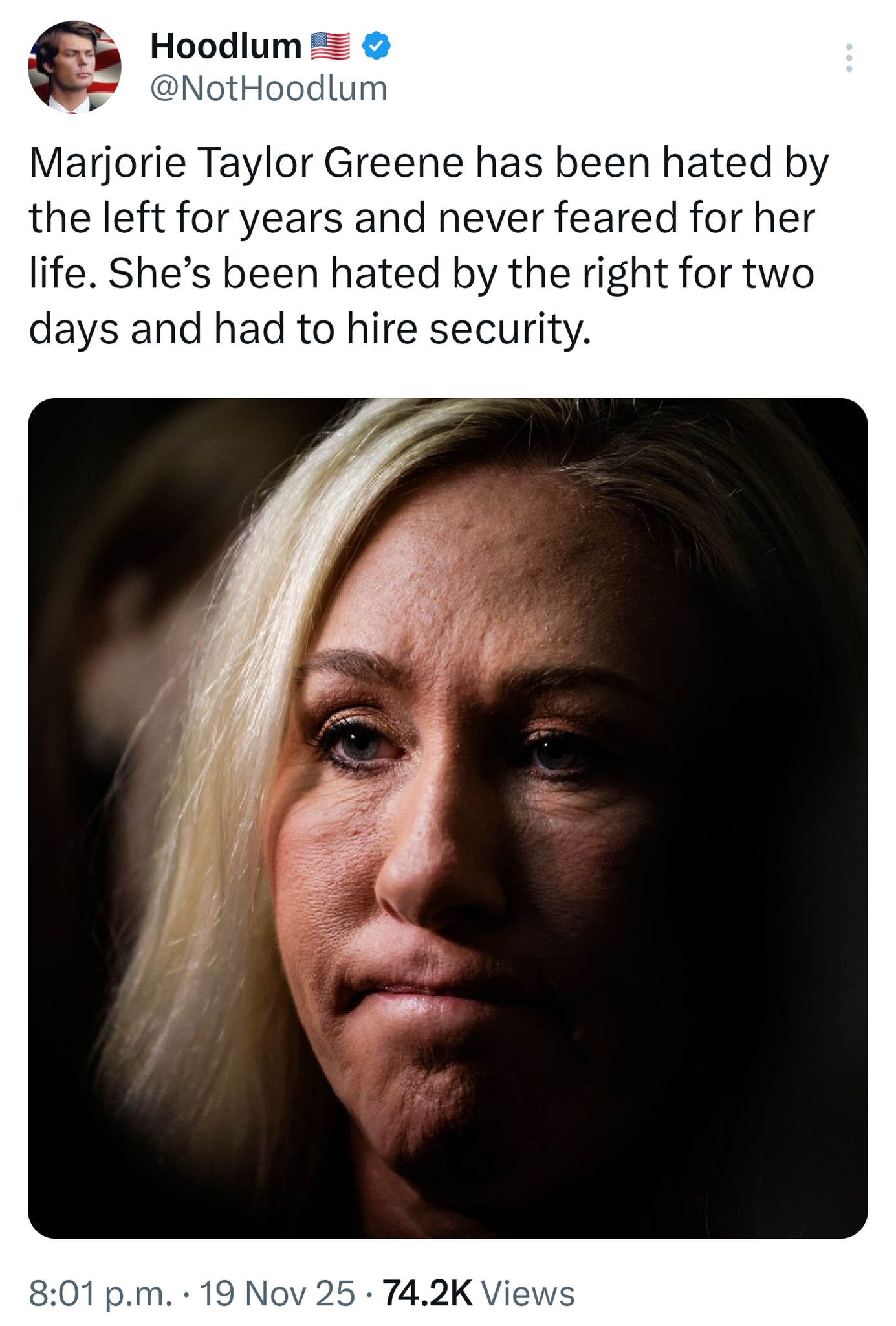 "Americans are used by the Political Industrial Complex of both political parties, election cycle after election cycle, in order to elect whichever side can convince Americans to hate the other side more," Greene wrote. "And the results are always the same — nothing ever gets better for the common American man or woman."