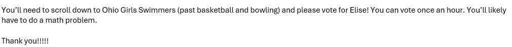 This young lady needs to be swimmer of the week. You can vote once per hour and apparently, you can double tap it by voting once on wifi and once on cellular data, or once on PC and once on your phone.