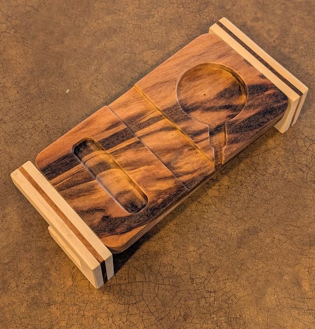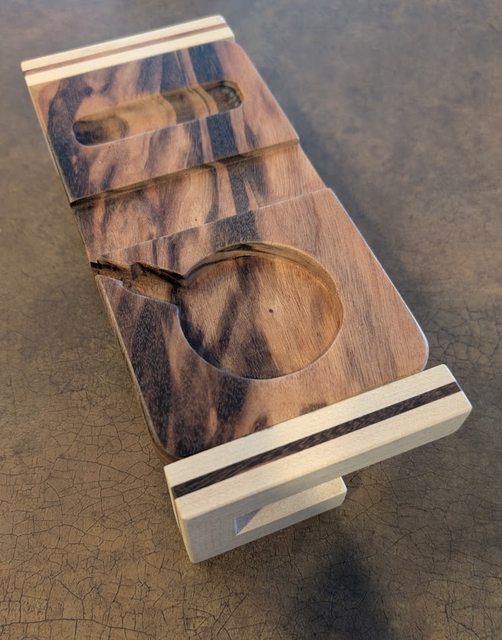 This is the wireless phone charger stand that I built. The body is Tigerwood and the hooks are Maple with Tigerwood inlay.